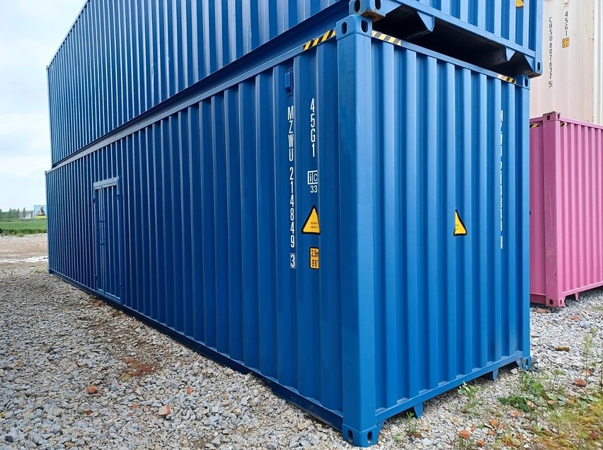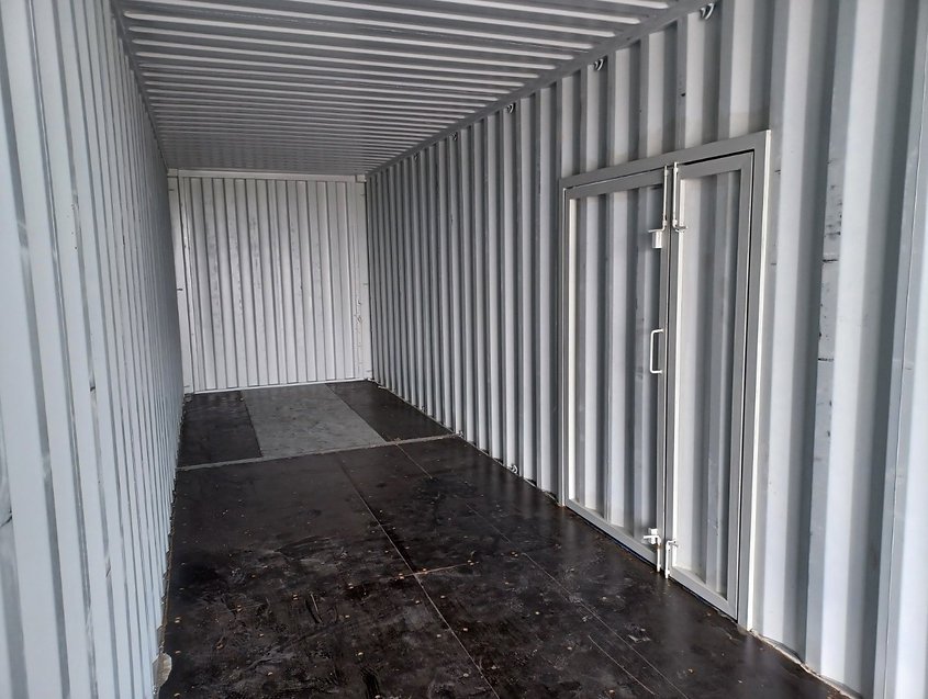 Este contenedor marítimo High Cube (HC) de 40 pies es ideal para transportar mercancías voluminosas o para utilizarlo como espacio de almacenamiento. Diseñado para ofrecer un mayor volumen interior que los contenedores estándar, está equipado con puertas adicionales en el lateral para facilitar el acceso, además de las puertas originales situadas en las paredes cortas.