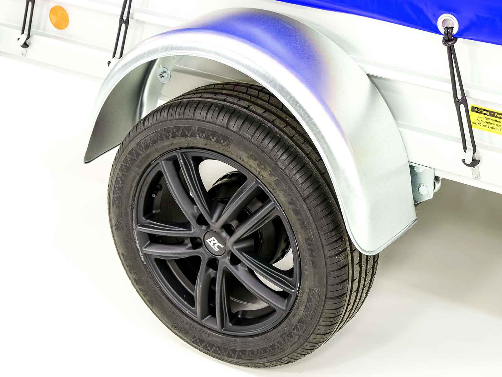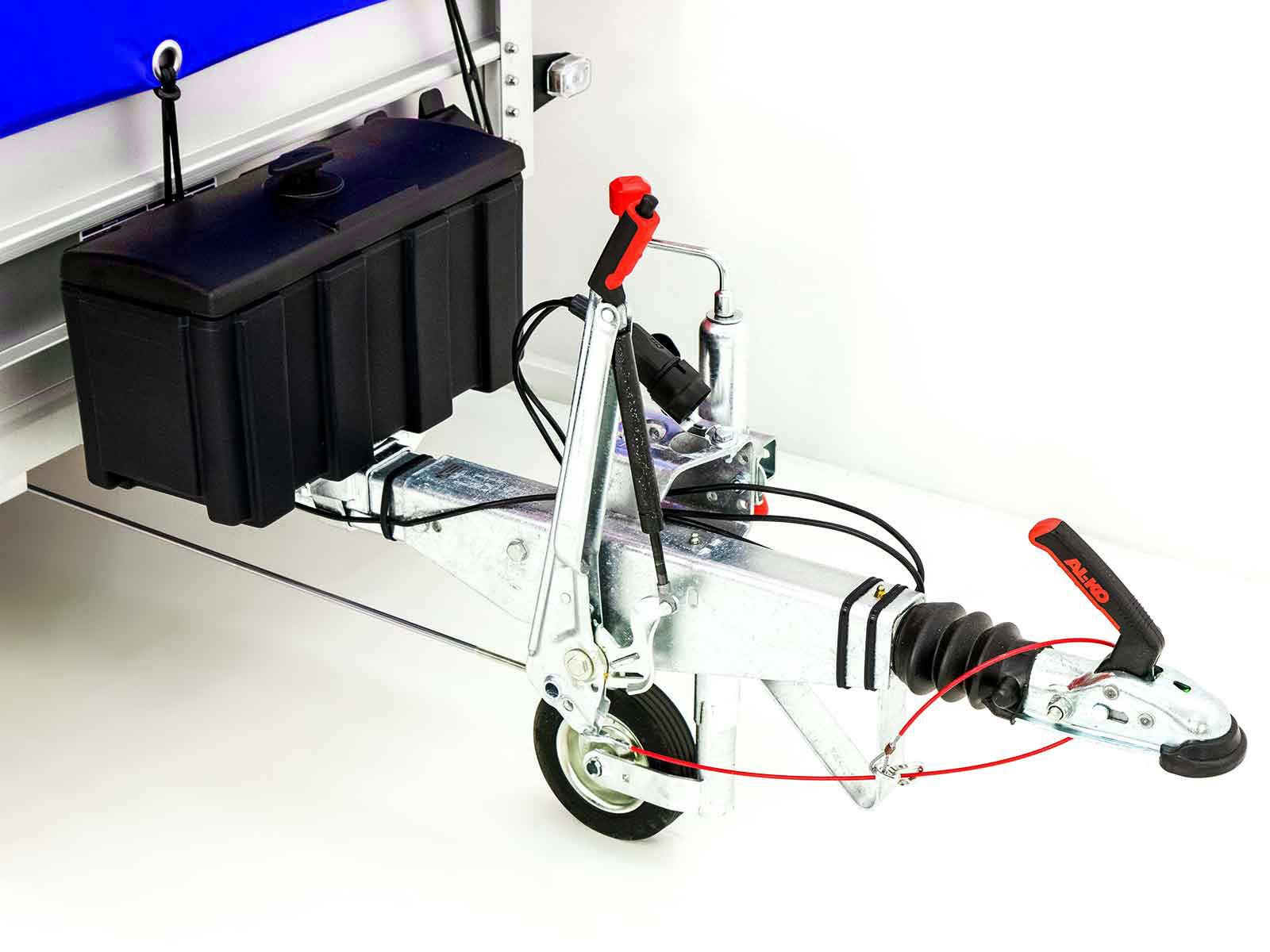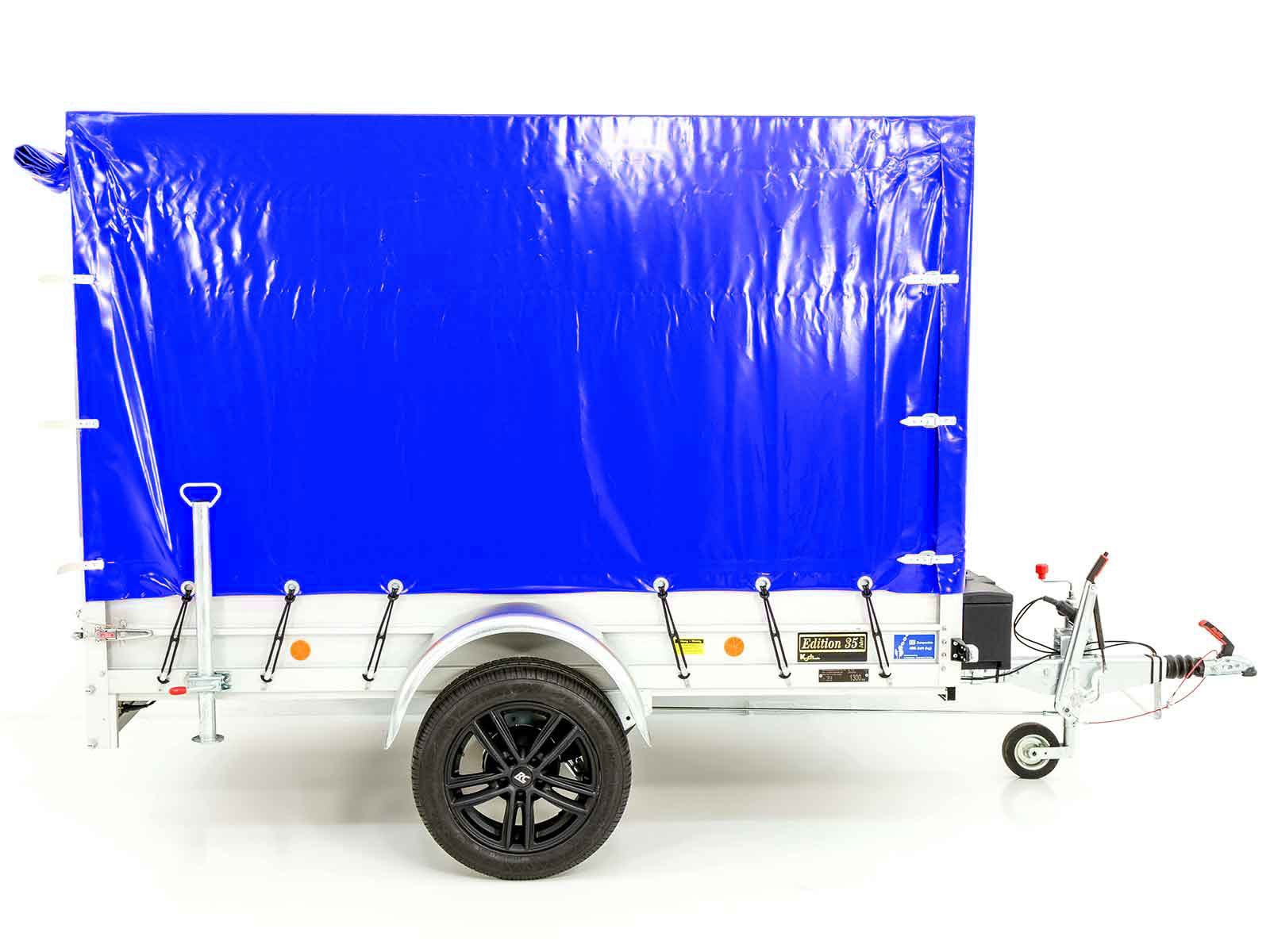 El remolque Koch « Edition 35 » en azul con una lona de 160 cm de altura ofrece una alta capacidad de carga y una construcción estable. Con el robusto marco de aluminio y la gran neumática, este remolque es excelente para el transporte de diversos bienes.