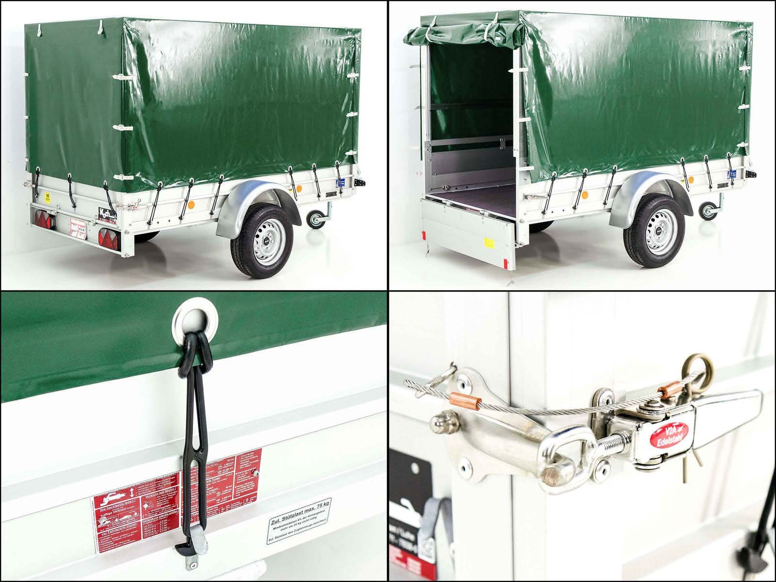 El remolque Koch Tipo U4 en verde es un remolque de aluminio versátil y robusto con lona alta (140 cm). Ideal para el uso diario y el transporte seguro de mercancías, este remolque ofrece: