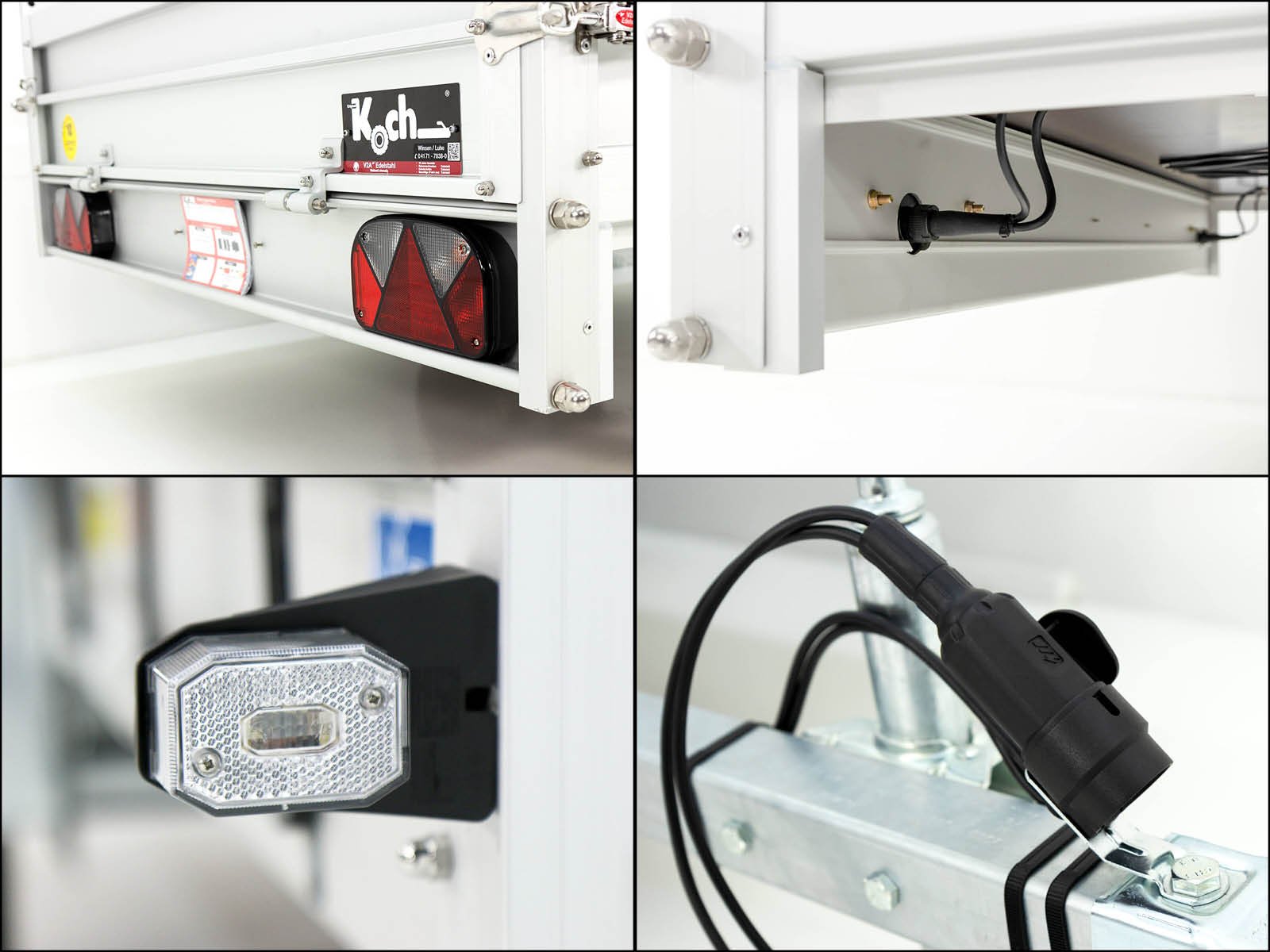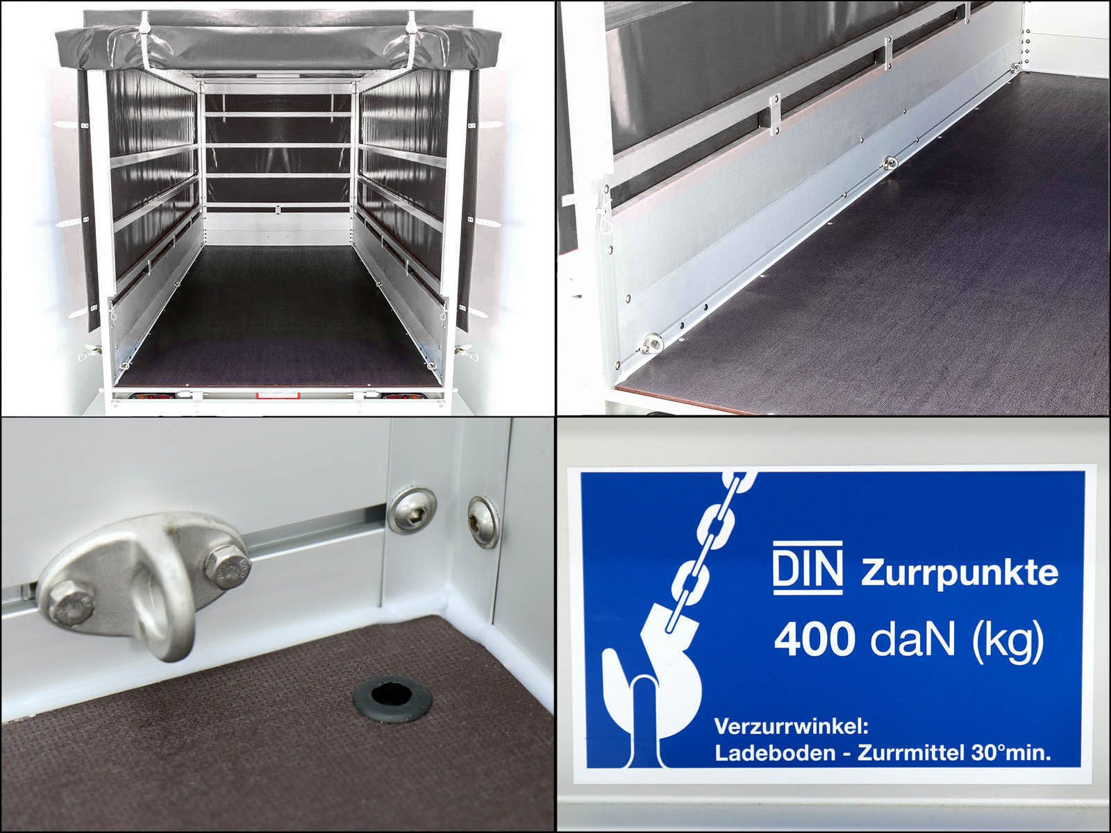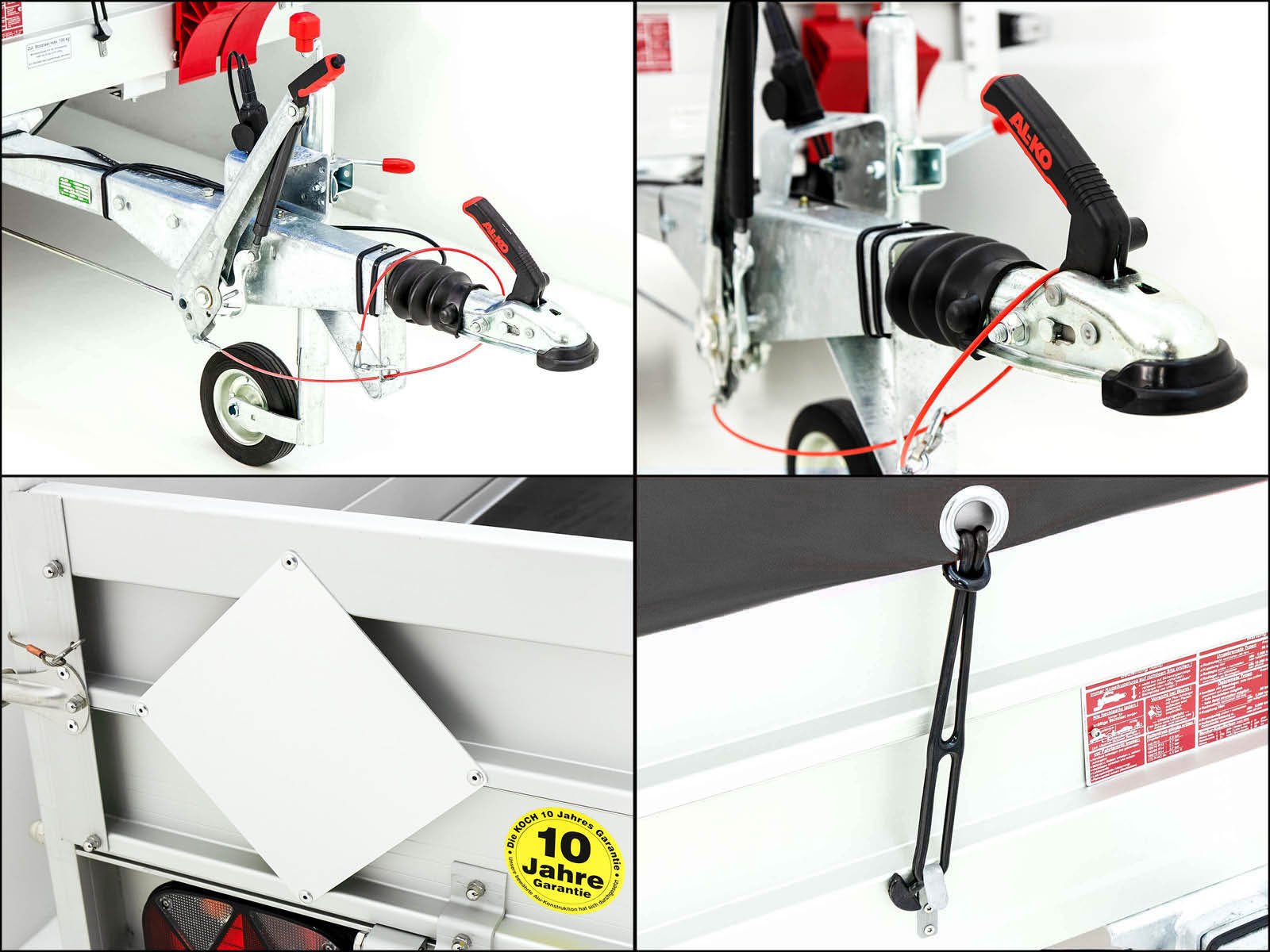 El remolque Koch con lona tipo 7.13 en antracita es un remolque ligero de aluminio con una lona alta de 160 cm. Ofrece una alta superficie de carga (150 x 300 cm) y una capacidad de carga útil de aproximadamente 1.020 kg. El remolque está equipado con una robusta construcción de aluminio y acero inoxidable y ofrece 10 años de garantía.