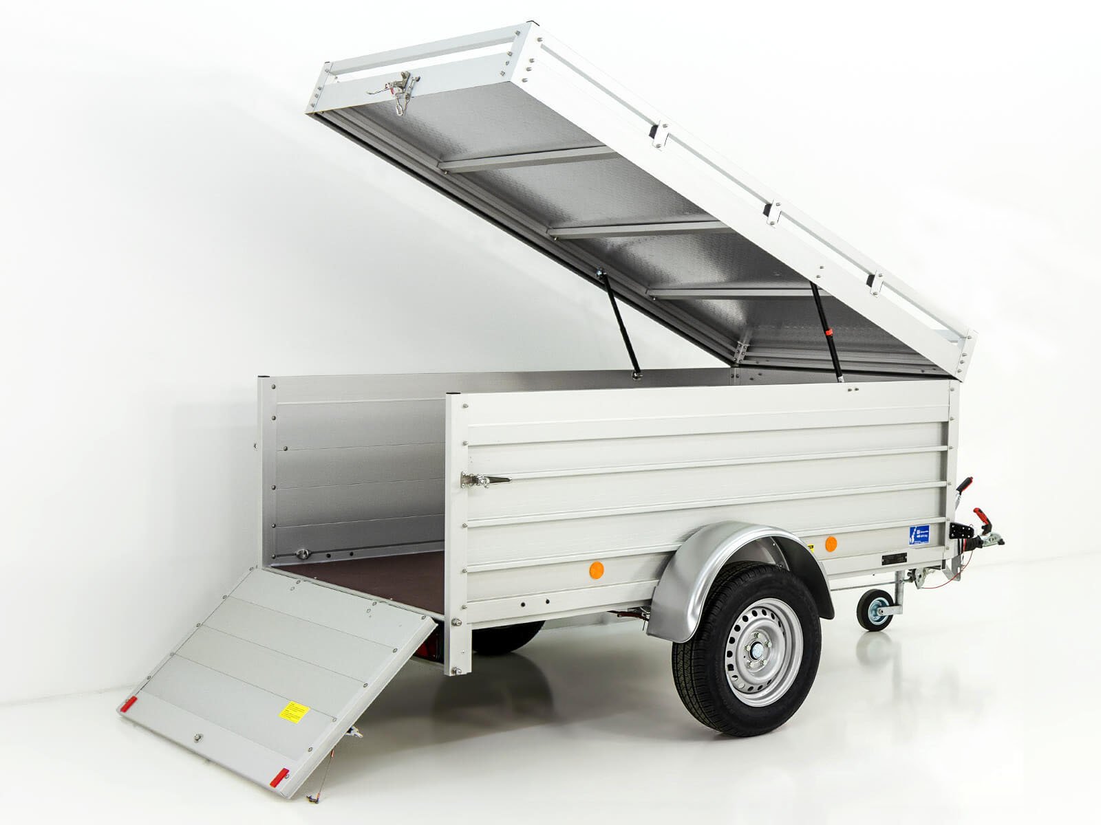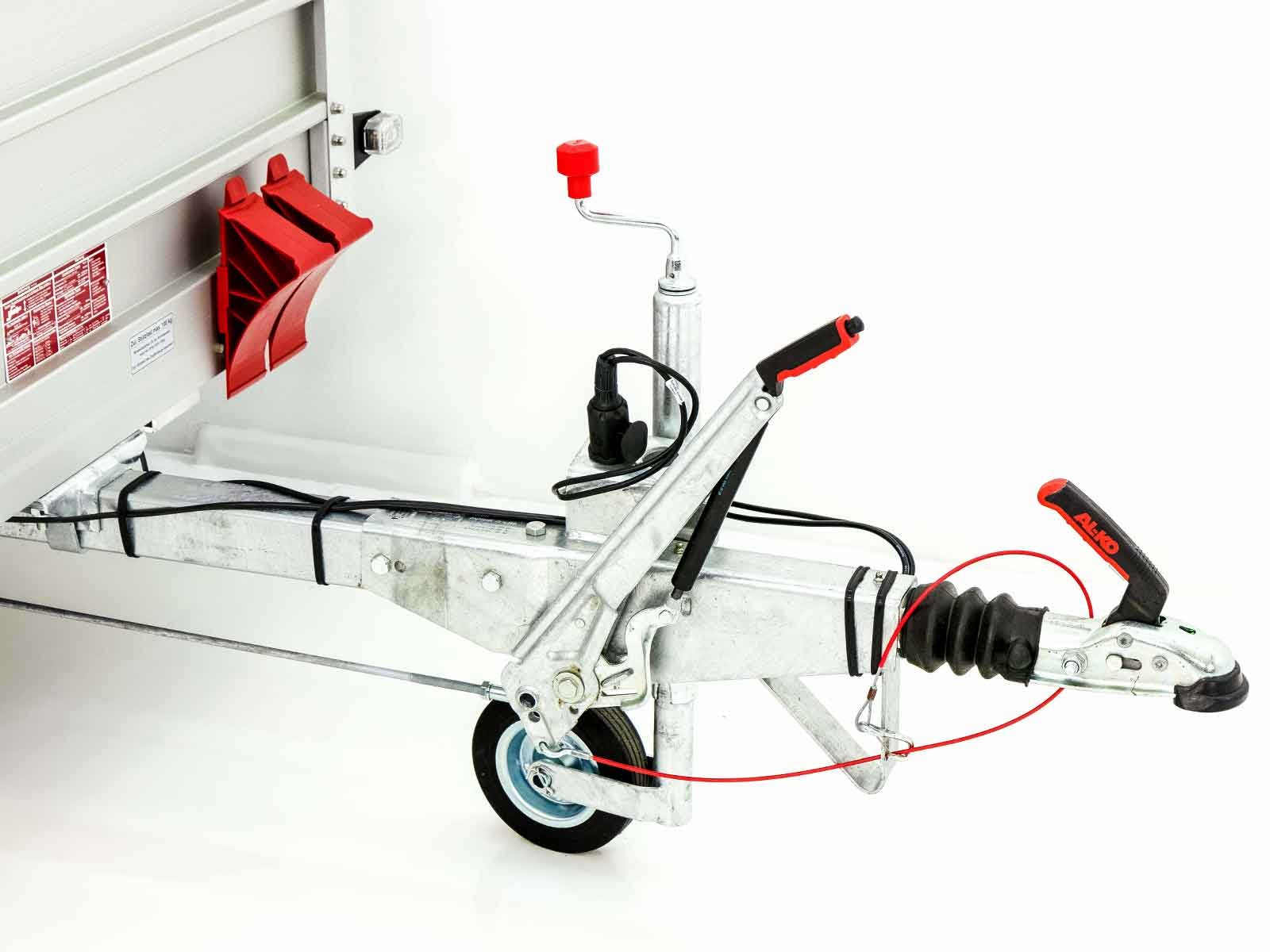 El remolque de cubierta Koch 125x250cm, tipo 4.13, con dimensiones de 125 x 250 x 80 cm, ofrece una carga útil de 1060 kg y un peso total permitido de 1300 kg. También este remolque está fabricado en aluminio, tiene una garantía de 10 años y se produce en Alemania.