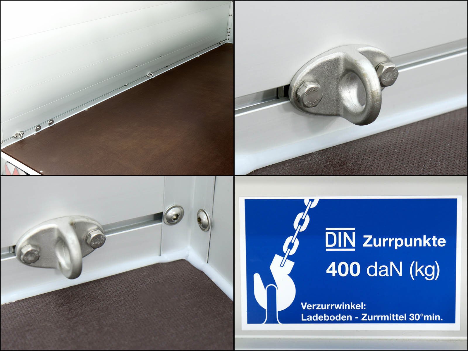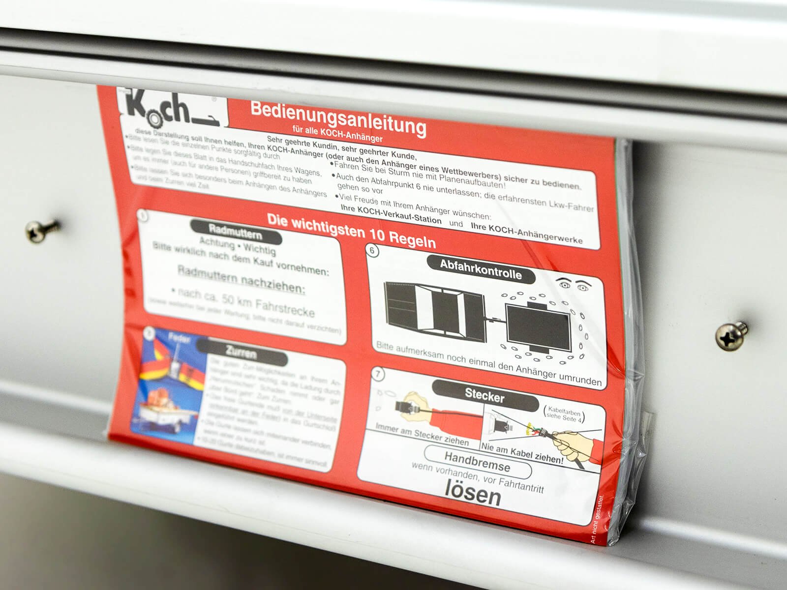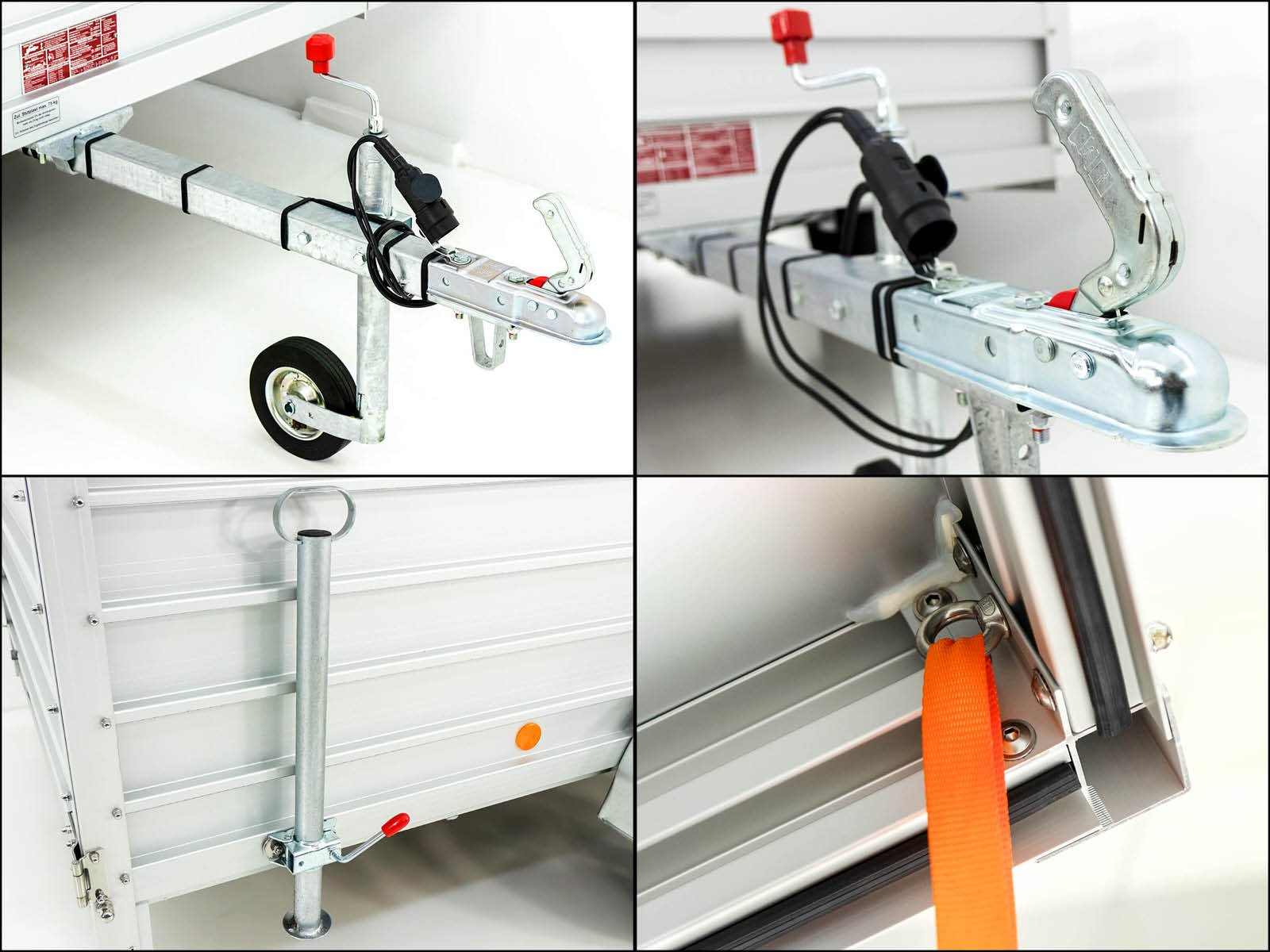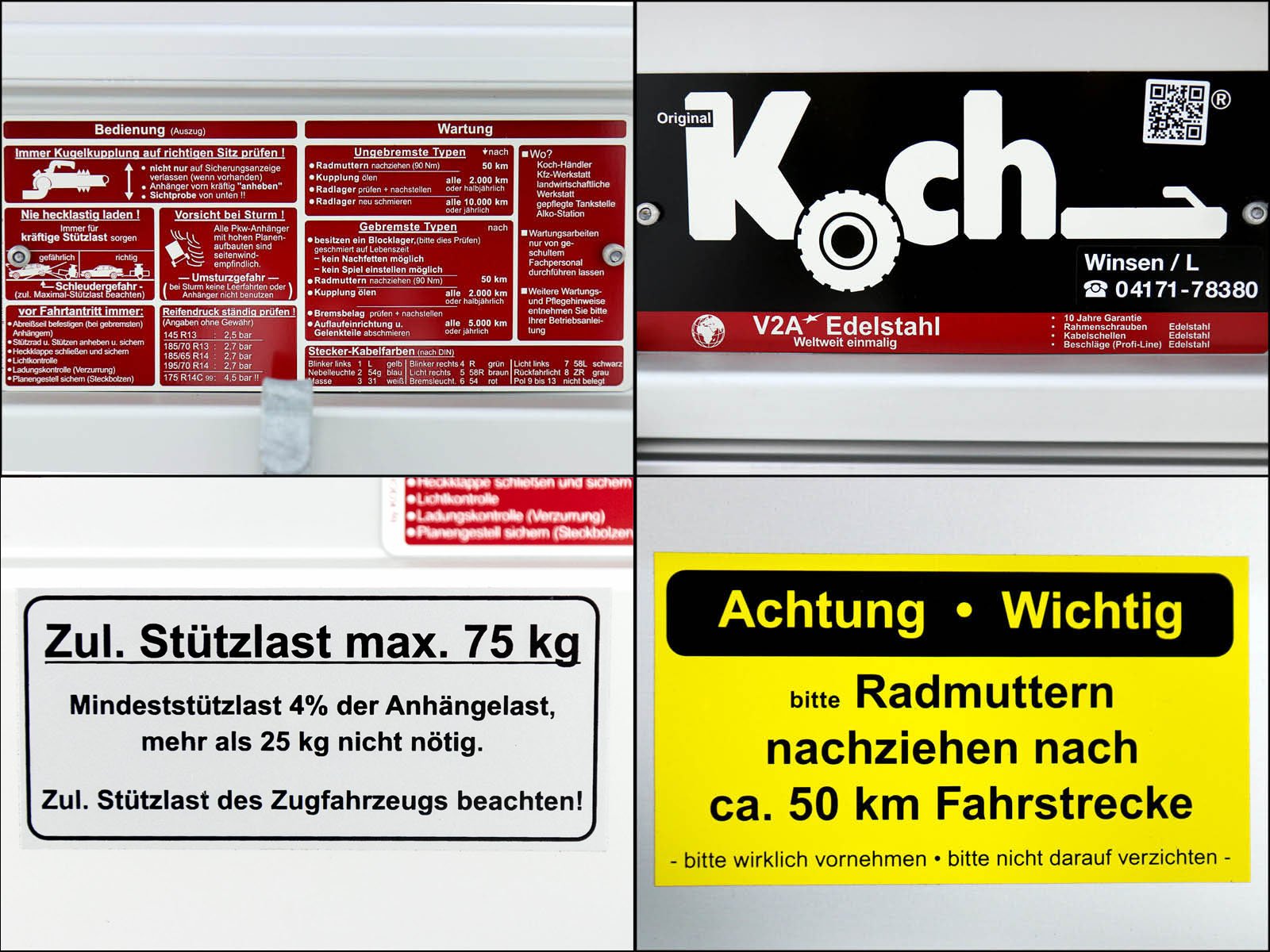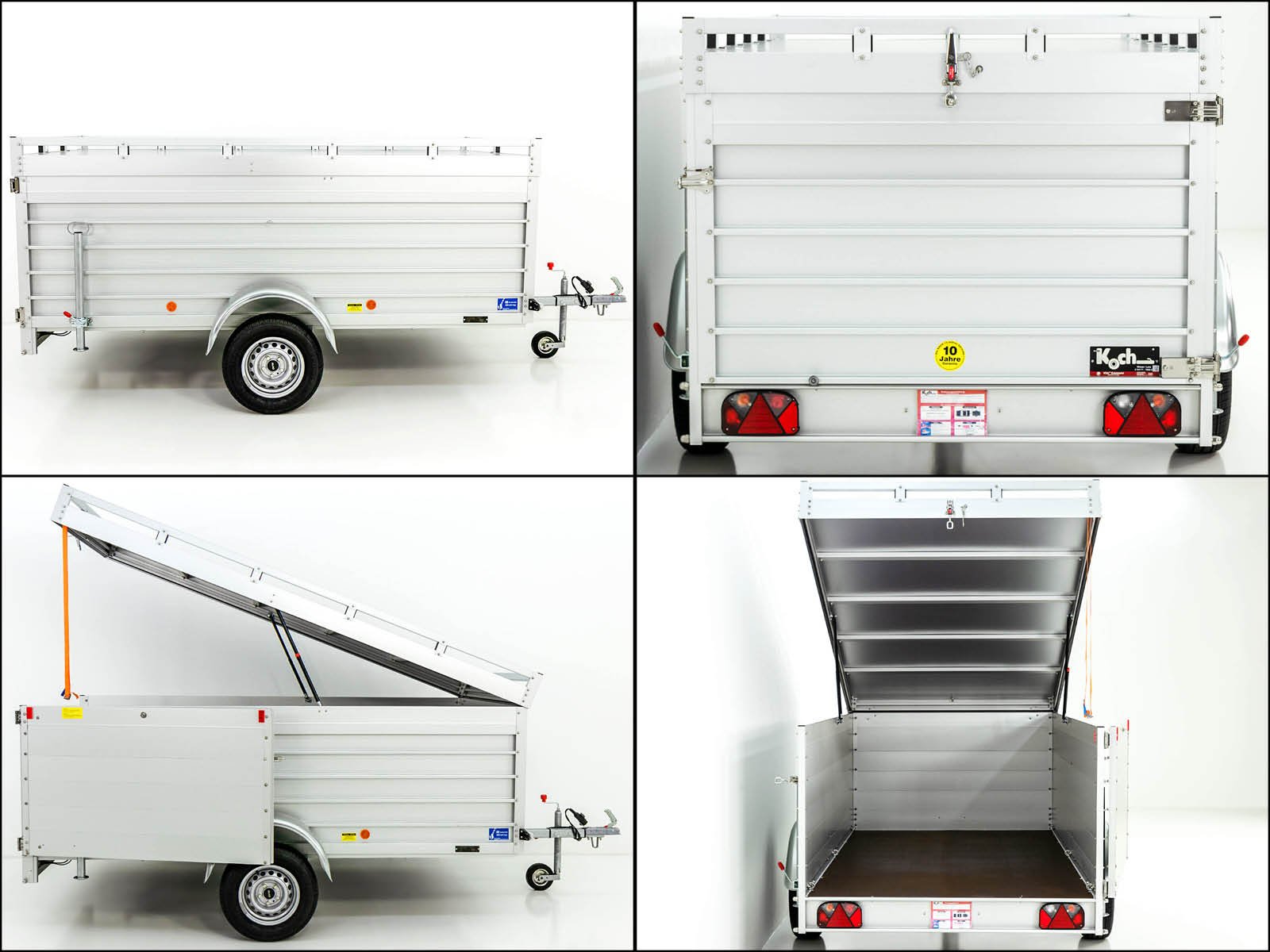 El remolque con tapa Koch tipo U7 ofrece una medida de carga de 150 x 300 x 95 cm y un peso total permitido de 750 kg con una carga útil de 500 kg. Este ligero remolque de aluminio ofrece una alta calidad con una garantía de 10 años y es fabricado por Koch-Anhängerwerke, un experimentado fabricante alemán.